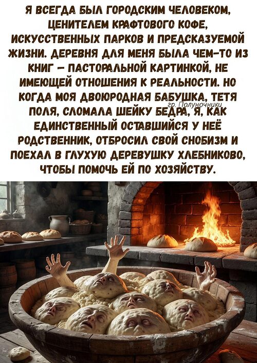 Я пытался уехать. Но автобус, ходивший раз в неделю, "сломался". Телефонная связь, и до того еле живая, пропала совсем. Я оказался в ловушке. Вся деревня следила за мной. В их спокойных, румяных лицах я теперь видел ту же пугающую пустоту, что и в глазах "семьи" из моей предыдущей истории. Они были не людьми. Они были сосудами, которые поддерживали жизнь своего хлебного божества.