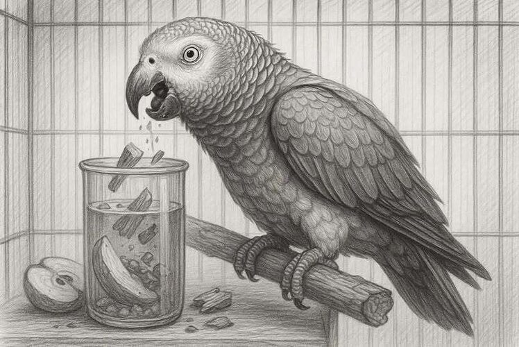 Где-то с год назад мы стали замечать, что наш попугай ведёт себя странно - яблоки, груши и другие фрукты тщательно пережёвывает и мякиш сбрасывает в поилку с водой. Потом ждёт несколько дней, пока не забродит.