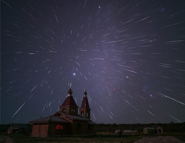 Композитный кадр метеорного потока Геминиды над Андриано-Андрусовским мужским монастырем в республике Карелия (Олонецкий район). Съемка велась в течение всей ночи с 13 на 14 декабря, а именно с 19.20 до 5.40.