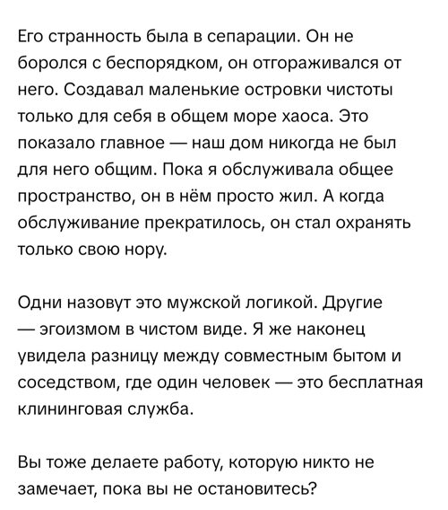 Если в доме,семье идёт раздел ТВОЕ и МОЁ,во всех сферах и деталях, и полностью отсутствует НАШЕ,то лучше сразу РАЗБЕГ!!! Дел и толку НЕ БУДЕТ.