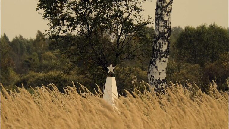 На другом конце поляны я, к своему удивлению, заметил небольшой, выкрашенный серой краской деревянный обелиск с маленькой звёздочкой на вершине. Перед ним виднелось углубление, заросшее травой, в котором угадывались очертания воронки.