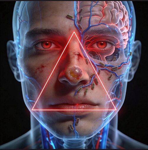 На вашем лице есть область, которую врачи называют Треугольником Смерти или "Треугольником Опасности". Диапазоны от моста носа до контура губ. Выскакивает прыщ , здесь не просто эстетическая проблема , это риск с высокими ставками на вашу жизнь.