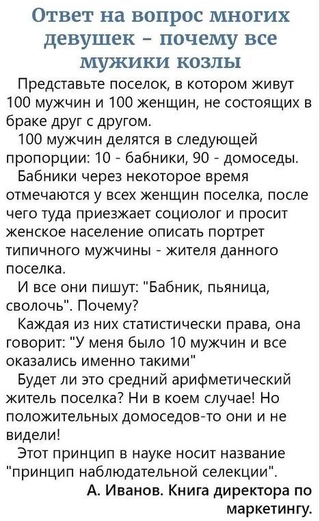 Смотря, через какую призму на это смотреть: мужчина, переспавший с десятью женщинами - бабник, но ведь по логике, и женщина, что переспала с десятью мужчинами - не святая!!! В итоге, опросили 10 бабников и 10... скажем так "ветренных" женщин...... А 90 мужчин и 90 женщин просидели дома!..... Не так ли??!