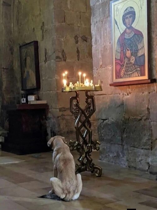 Из церкви выгонят собаку люди...