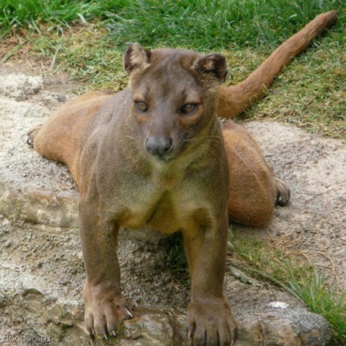 На острове Мадагаскар сохранились такие животные, которых нет не только в самой Африке, но и во всем остальном мире. Одним из редчайших животных является Фосса - единственный представитель рода Cryptoprocta и самое крупное хищное млекопитающее, обитающее на острове Мадагаскар. Внешний вид фоссы немного необычен: это нечто среднее между виверрой и небольшой пумой. Иногда фоссу называют и мадагаскарским львом, так как предки этого животного были намного крупнее и достигали размеров льва. Фосса имеет приземистое, массивное и немного удлиненное туловище, длина которого может доходить до 80 см (в среднем она составляет 65-70 см). Лапы у фоссы длинные, но достаточно толстые, причем задние лапы выше передних. Хвост часто бывает равным длине тела и доходит до 65 см.