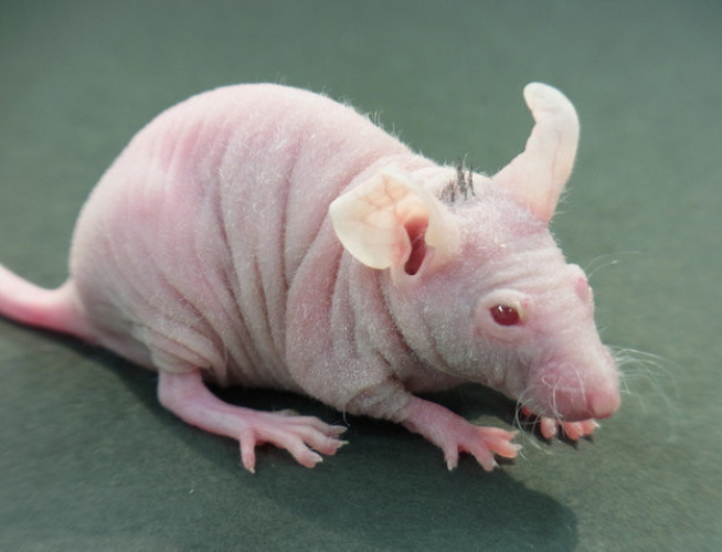У этой мыши очень тонкая, можно сказать, просвечивающая кожа, а все туловище покрыто морщинистыми складками. Только большие уши остаются гладкими.