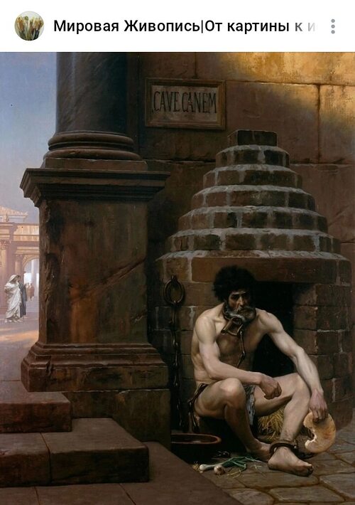 Известно, что табличка с предупреждением, выведенным на латыни, была обнаружена археологами при раскопках древних Помпей. Её смысл в контексте работы поддаётся разным трактовкам. С одной стороны это унизительное оскорбление, согласно которому с пленником обращаются как с презренным животным. По другой версии оно может означать предостережение, намекающее на возможное восстание возмущённых унижениями рабов. Пока вольные граждане наслаждаются прогулкой под ласковым итальянским солнцем, позабытый в тени герой вынашивает в сердце план противостояния своим мучителям.