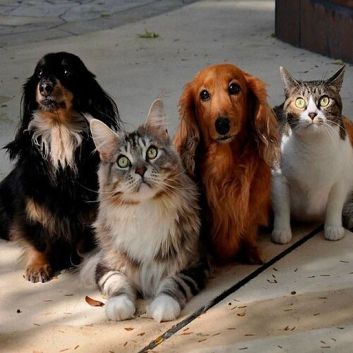 На освободившейся и очищенной от строительного мусора площадке, оставшейся после дома, сидели три кота и две маленькие собаки.