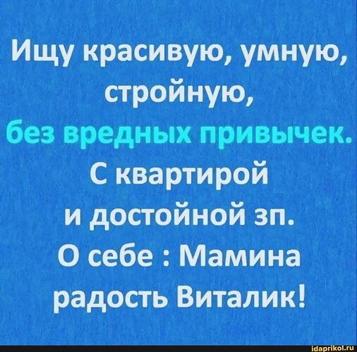 Мужчина выставил минимальные требования достойной женщины. Если посмотреть, какие требования нарцисски выставляют достойному мужчине... Ой, мама !