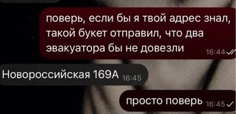 до меня дошла Ваша логика! на фото цветов - фото борща, ясно. А вот если пришлют дикпик, курагу в ответ отправляете, надо полагать?