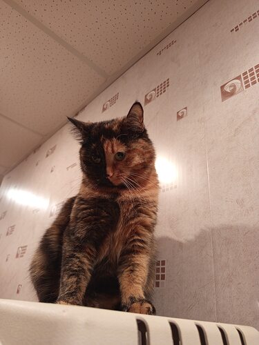 Красивая черепаховая кошка — выглядит спокойной и уверенной.