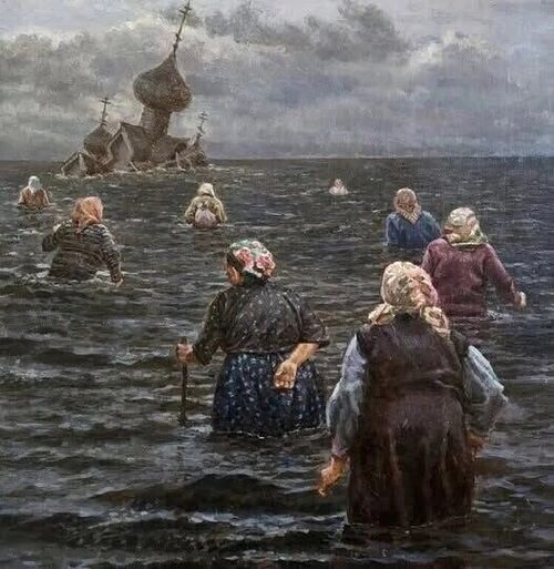"Слезохранилище" (2025 г.) Художник - Андрей Шатилов. Картина "Слезохранилище" Андрея Шатилова - это не просто живописное полотно, а глубокий философский образ, заставляющий задуматься о судьбах людей, переживших трагедии прошлого. На картине изображены женщины, по колено погруженные в воду, медленно идущие к храму. Этот сильный визуальный символ наполнен эмоциями и смыслом, отсылая нас к истории затопленных русских городов и сел, исчезнувших с лица земли во время строительства ГЭС. "Вдохновляясь историей затопленных во время строительства ГЭС русских городов и сёл, эту картину я создал как посвящение нашим предкам, на долю которых выпало немалое количество испытаний. Они принимали невзгоды с достоинством, верой в Бога и светлое будущее" - Андрей Шатилов Затопление территорий при возведении гидроэлектростанций стало трагедией для тысяч людей. Один из самых известных примеров - Калязин, часть которого ушла под воду в 1940-х годах при строительстве Угличской ГЭС. Теперь от некогда цветущего города осталась лишь колокольня Никольского собора, одиноко возвышающаяся над водами Волги. Подобная судьба постигла Мологу, исчезнувшую под водами Рыбинского водохранилища, а также множество небольших деревень, чьи дома, церкви и кладбища навсегда скрылись под водой.