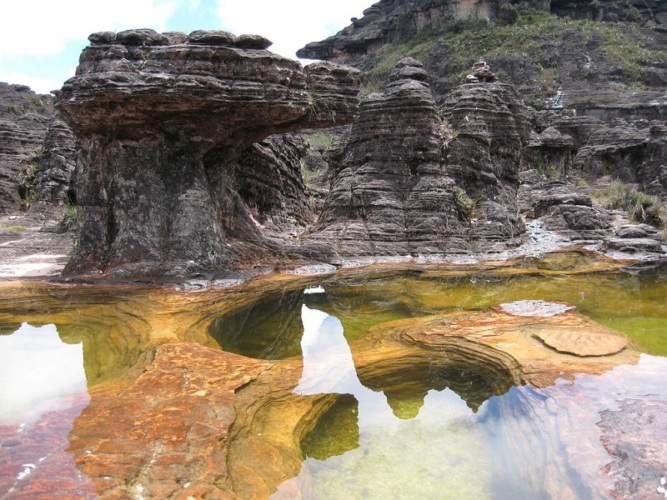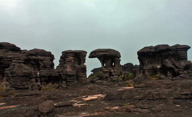 Практически вся поверхность плато горы черная от "пустынного загара" и населяющих верхний слой камня микроскопических водорослей. Лишь в тех местах, где песчаник не подвергается влиянию солнца и дождя или регулярно омывается водой, проявляется его настоящий цвет - ярко-розовый. Разная скорость разрушения слоев песчаника поспособствовала образованию на плато большого количества причудливых скал. Кое-где камень рассекают огромные трещины, в которые впадают несколько рек, позже вырывающихся из скал шумными водопадами. Вода покрывает примерно пятую часть плато: торфяные болота, ярко-розовые лужицы, кристально-чистые озера, быстротечные реки, русла которых на протяжении нескольких сотен метров усеяны кристаллами горного хрусталя.