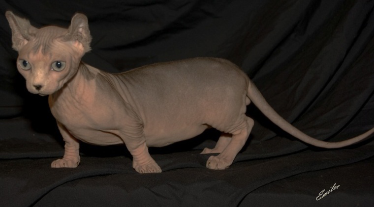 3 место. Минскин - еще одна карликовая порода кошек без шерсти, выведенная в США путем скрещивания манчкинов и бесшёрстных канадских сфинксов. Средний рост - 19 см, средняя масса тела от 1,8 до 2,7 кг.