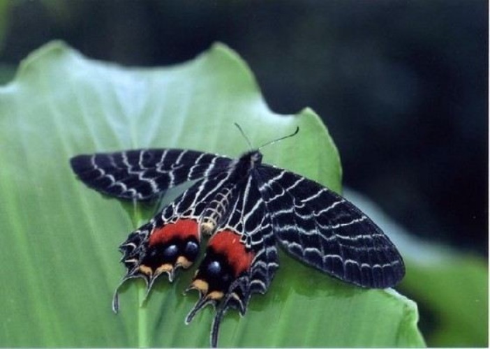 Даже самого искушенного ценителя бабочек поразит уникальная форма ее крыльев, которые отдаленно напоминают стрекозиные. Их размах, бывает, достигает десяти сантиметров. Каждое из крыльев продолжается тремя небольшими хвостиками, придающими им поистине очаровательный вид. К счастью, эти бабочки ядовиты и, соответственно, несъедобны. Потенциальных едоков предостерегают яркая красно-оранжевая расцветка и круглые ярко-алые пятна на концах крыльев.
