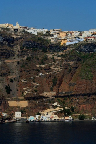 В 1715 году островные жители встроили крутую лестницу на отвесном горном склоне, таким образом они могли добираться от моря к вершине и обратно. Чтобы помочь нести груз и пассажиров от судов к городу, использовались ослы. В 1930 лестница была улучшена, и задействовано большее количество ослов. Наконец, в 1979 была установлена канатная дорога, чтобы автоматизировать процесс - но самая интересная поездка - по-прежнему прогулка на осле. Зигзагообразная лестница от моря до города вымощена камнем, и из-за множества извилин расстояние от одного конца до другого составляет 1300 метров. Всего насчитывается 657 10-сантиметровых ступенек, а подъем обеспечивает очень хорошую разминку в солнечный день. Санторини занимает особое место среди достопримечательностей Греции, его мечтает посетит каждый, кто бывает в этих местах.