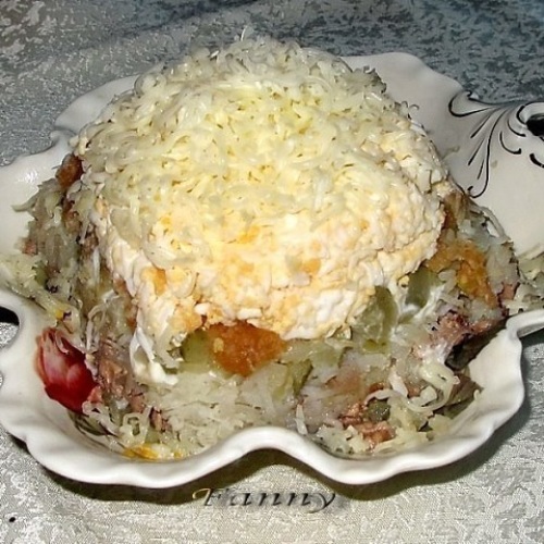 Я в этот раз майонеза брала совсем немного, добавляла его только между двумя слоями - на картошку, и на яйца, т.к. все остальные продукты достаточно сочные и им не нужна дополнительная пропитка, вкус всех продуктов так лучше чувствуется, чем тогда, когда майонез добавляют после каждого слоя, да и салат получается менее калорийным, что тоже важно.
