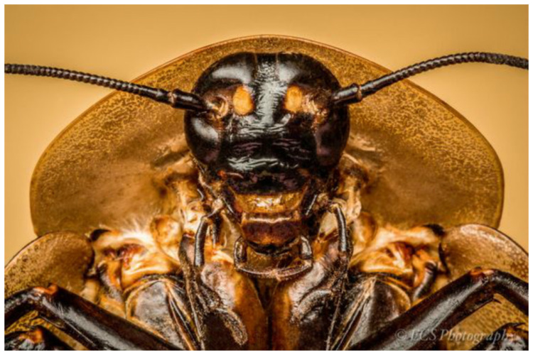Это был бы обычный черный таракан с блестящим хитиновым панцирем, если бы не наличие на верхней части спины странного рисунка. На светлом фоне изображена страшная черная физиономия чудовища с оранжевыми глазами.