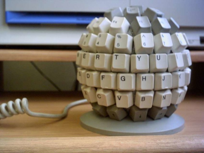 Одна из первых печатных машинок, разработанная датским изобретателем Расмусом Маллингом-Хансеном, имела клавиатуру в форме полусферы и называлась "пишущим шаром Хансена". К идее шарообразной клавиатуры возвращаются и в наше время. Но пока — без успешного применения на практике.