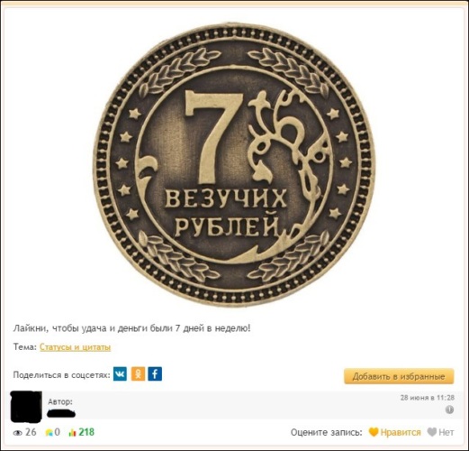 29 июня 205 лайков( а это пример того, во что сейчас верят люди. на первых местах денежные записи, и только потом молитвы, хотя в них я тоже не верю если честно)