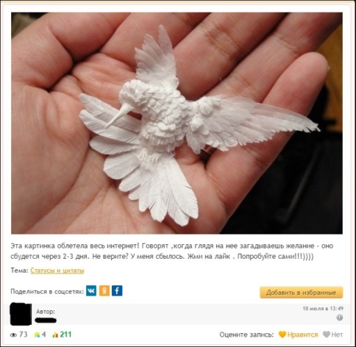 18 июля 211 лайков(и снова птица счастья, но принадлежит она уже другому автору, это про то как копируют друг у друга посты которые набрали много лайков)