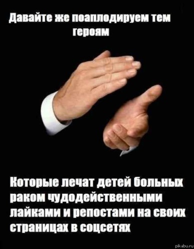 Я вот не вижу связи между лайками и деньгами. Я ведь тоже в ленту записи выкладываю и что то мне ни кто не платит. А сайту ведь наплевать, больной ребёнок или маньяк педофил, то есть если лайки приносили бы деньги, то я бы их тоже получала, но увы денег я не вижу за свои записи. Я знаю что на YouTube можно деньги заработать. И то там платят не за лайки, а за просмотры и только при условии что тот, кто выложил видео, разместил там по чьему то заказу рекламу, а лайки они и даром ни кому не нужны. А тут автор пытается оправдать своё попрошайничество лайков за счёт чужого горя, да ещё пытается выставить себя умной, а всех остальных дураками. Если бы можно было собрать лайками деньги на операции, то благотворительные фонды не просили бы перевести им деньги или отправить платные СМС, а просили бы ставить лайки( вот я что то такого явления не наблюдала). Так что Ваши лайки ни как не помогают детям. Они помогают автору поста подняться в рейтинге.