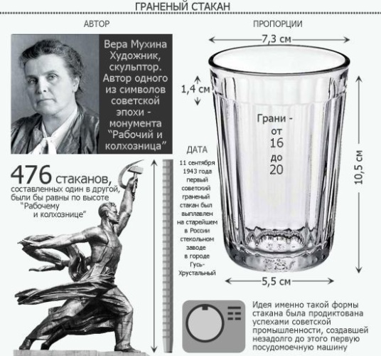 Кстати, об экстерьере. Считается, что уникальную форму ему придумала советский скульптор Вера Мухина — автор знаменитого мемориала "Рабочий и колхозница" (отсюда и одно из народных названий стакана — "мухинский").