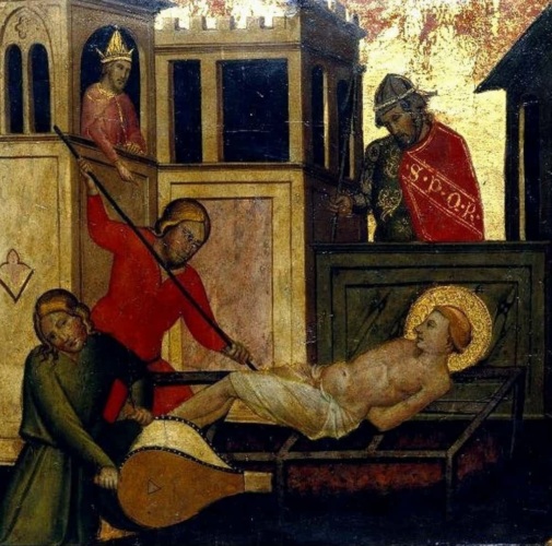 Гридирон - решетка для пытки огнем. На картине: пытка святого Лаврентия на гридироне. Жертву постепенно поджаривали на горячих углях. Этот метод пытки упоминается в житиях святых, однако вряд ли он дожил хотя бы до Средних веков.