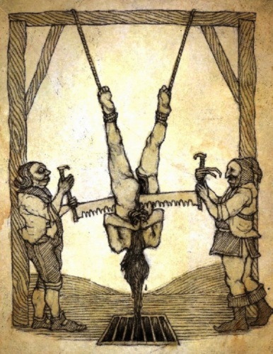 Очень жестокий метод казни, в который трудно поверить. Так казнили грешников во времена Инквизиции. Жертву подвешивали вверх ногами, чтобы кровь не переставала поступать в голову и снабжать мозг кислородом, и начинали медленно пилить начиная с промежности вниз. Иногда доходили до половины и останавливались, а человек все еще был в сознании.