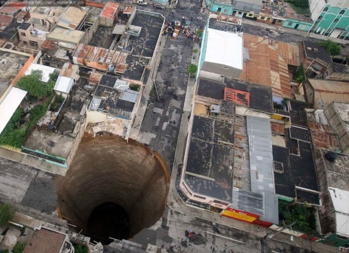 Дыра почти идеальной круглой формы диаметром около 20 метров и 30 метров глубиной образовалась в июле 2010 года в одном из районов города Гватемала. Дно воронки не просматривается даже с вертолета. Образовавшись дыра поглотила трехэтажное здание швейной фабрики и несколько человеческих жизней. По мнению ученых круглая форма воронки предполагает наличие под ней карстовой полости.