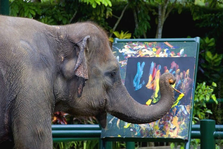 Слон - одно из немногих животных, способных применять подручные инструменты (то есть, по сути, орудия труда). Например, обмахиваться ветками, защищаясь от мух.