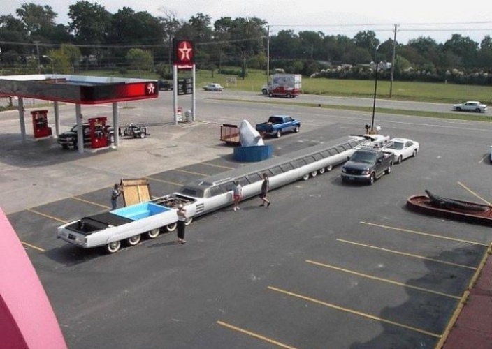 Общая длина этого автомобиля - более 30 метров. Держится громадина на 26 колёсах. В этом более чем просторном автомобиле есть джакузи с подогревом, солярий, бассейн, несколько кроватей и даже предусмотрена вертолётная площадка.