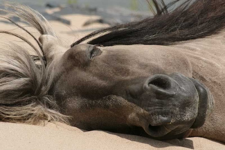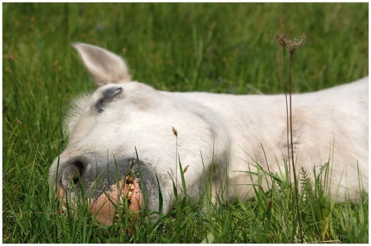 Когда люди спят, они, бывает, видят сны. Вероятно, у лошадей происходит то же самое. Если понаблюдать, через закрытые веки этих животных заметно движение глаз вверх-вниз, да и ногами лошади во сне тоже двигают, словно бегут рысью. От маленьких детей приходилось слышать вопрос о том, болит ли у лошадей голова, но кто без сомнения для себя самого на него ответит? И о том, видят ли лошади сны, можно лишь делать предположения. Наверное, видят. Не зря ведь люди создали даже поэтический образ спящей лошади — образ светлого, недосягаемого и прекрасного. Когда вспоминаешь о нем, сразу приходит на память загадочная белая лошадь из мультика "Ёжик в тумане", который и заканчивается вопросом: "Как же там лошадь?".