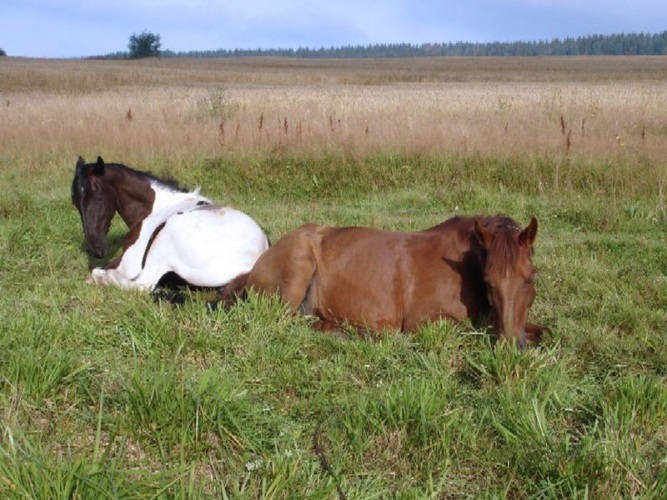 И все-таки отдых стоя для лошади - лишь имитация сна. В покое и безопасности она, как и люди, предпочитает стоянию с закрытыми глазами отдых "на боковой", можно даже сказать, "отбросив копыта". И ученые предполагают, что для того, чтобы войти в глубокую фазу сна, лошади нужно непременно лечь. Как и у людей и многих других животных, у лошадей имеется две фазы сна: фаза медленного сна и фаза быстрого движения глаз (глубокий сон). Чаще всего, быстрый сон бывает тогда, когда лошадь ложится на бок, нежели, если она лежит на груди.