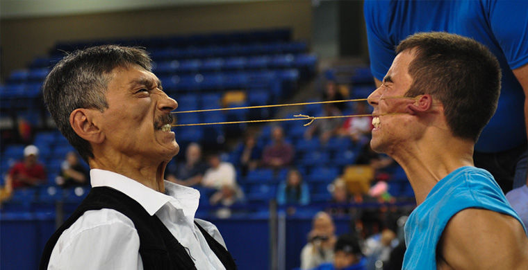 В программу Всемирных эскимосских олимпийских игр входит особое соревнование — перетягивание нити ушами. На двух концах нити делаются петли. Противники усаживаются лицом к лицу, на ухо каждому надевается петля. И как другие перетягивают руками канат, они ушами (а скорее — головой и даже наклонами туловища) пытаются перетянуть нить, пока кто-то не откажется от дальнейшего состязания из-за боли. Надо сказать, не каждое ухо способно такую борьбу выдержать.
