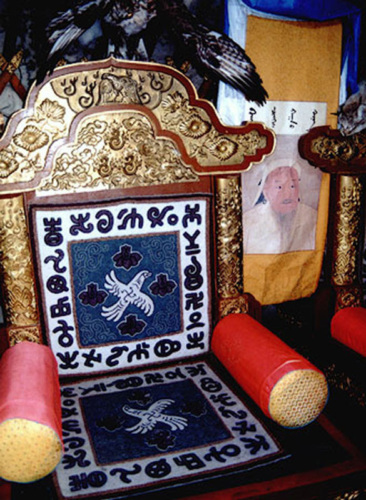 Реконструкция трона Чингисхана с родовой тамгой со свастикой.
