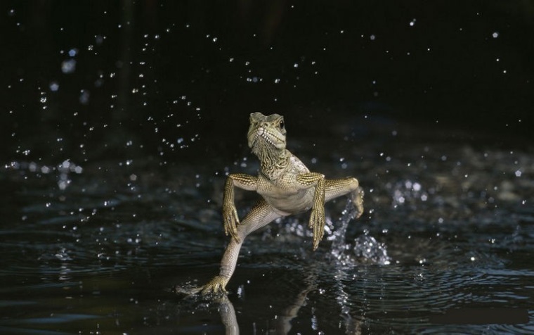 Если просмотретьВвидеосъемкуВтого, как василиск (Вasiliscus) бегает по воде, то складывается впечатление, что он просто левитирует по водной глади. Конечно же, наука попыталась понять, каким образом этому маленькому животному удается столь невероятный трюк. Для этого ящерицу выпустили в бассейн, подсветили поверхность воды лазерными лучами и сняли процесс бега на скоростную камеру.