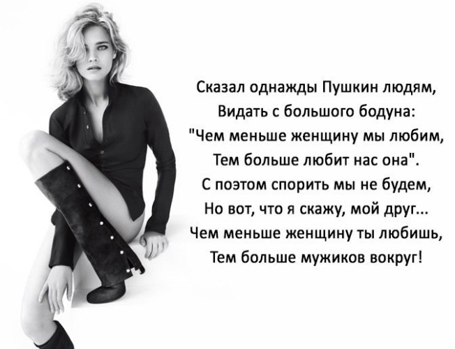 Чем меньше женщину мы любим, Тем легче нравимся мы ей И тем ее вернее губим Средь обольстительных сетей. Так точно думал мой Евгений. Он в первой юности своей Был жертвой бурных заблуждений И необузданных страстей.