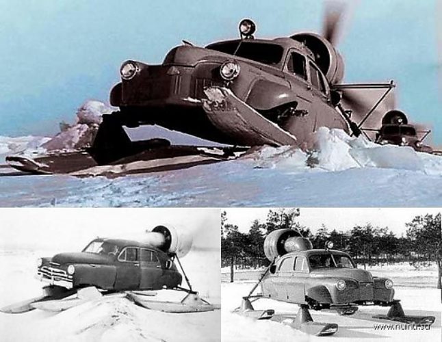 Советские аэросани представляли собой кузов серийного автомобиля Победа, который был установлен на лыжи с авиационным мотором АИ-14 мощностью 260 л. с.