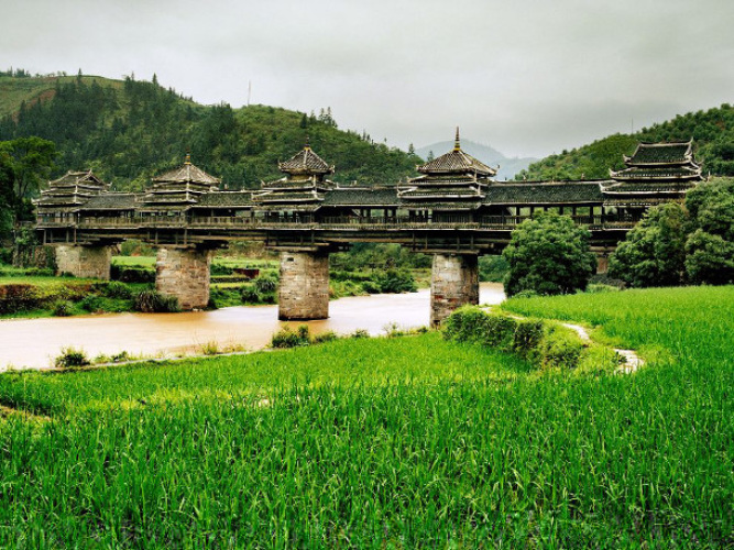 Этот мост называют ещё "Ветер и Дождь". Он прячется среди рисовых полей и гор в китайской провинции Гуанси и соединяет берега реки Линси. Он был построен в 1916 году народом Дун, этническим меньшинством Китая. Мост состоит из 5 отдельных пагод с галереями и павильонами. Традиционная китайская архитектура создает фантастический внешний вид, но самое удивительно в этом строении то, что для его сооружения не был использован ни один гвоздь. Мост держится при помощи нескольких поражающих воображение архитектурных трюков.