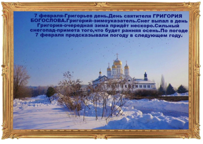 В праздник Григорьев день (Григорий-весноуказатель), отмечаемый 7 февраля 2018 года, можно судить о погоде не только на наступивший год, но и на будущий. Вот почему старики до сих пор очень внимательно наблюдают за погодой, птицами и животными на Григория-весноуказателя 7 февраля.