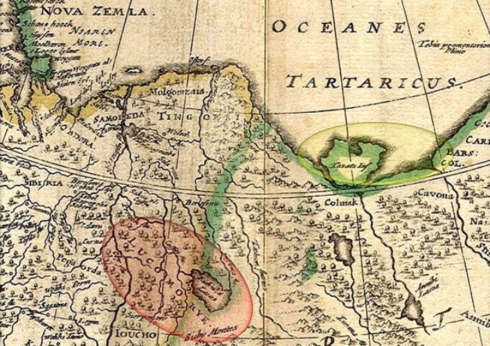 Европейские картографы сами в этих местах не бывали. Скорее всего, при составлении карт они опирались на описание этой местности путешественников, в частности Сигизмунда Герберштейна. Он дал его в "Записках о Московии": "в горах по ту сторону Оби", "Из Лукоморских гор вытекает река Коссин. Вместе с этой рекой берет начало другая река Кассима, и протекши через Лукоморию, впадает в большую реку Тахнин".