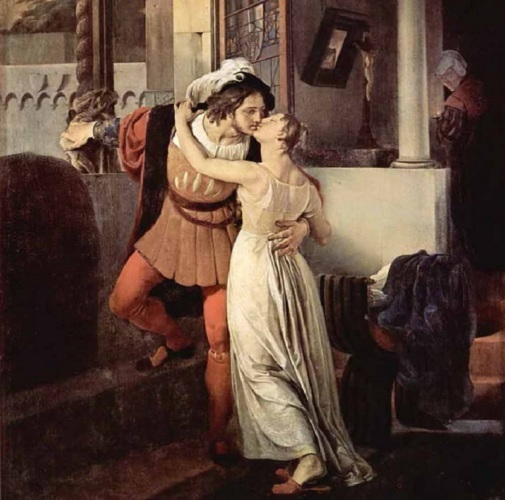 Айец - один из самых известных представителей итальянского романтизма, однако эту сцену он изображает почти как жанровую, в бытовом ключе. Джульетта не одета и не причесана, Ромео разрывается: ему пора уходить, но его тянет остаться с женой.