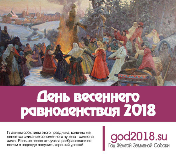 Русский народ отмечал в равноденствие Комоедицу или Масленицу. Было принято печь блины — символ Солнышка. Также на Масленницу были приняты большие шумные уличные гуляния. Главным событием этого праздника является сжигание соломенной куклы Зимы. Огонь забирает физическое тело Зимы и преобразует его в огненное — в тело Духа. Зима улетает в непроявленный мир, чтобы вернуться в следующем цикле.