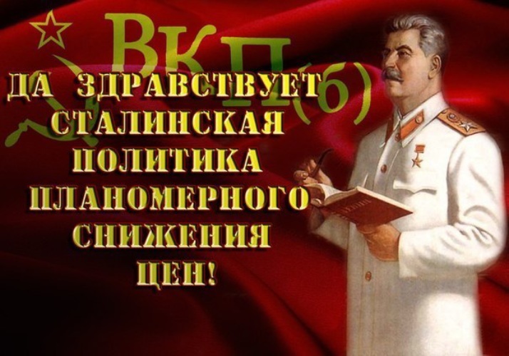 Люди моего поколения помнят, как в конце апреля каждого послевоенного года при жизни Сталина диктор торжественно объявлял об очередном снижении розничных цен. Родители просили своих детей сесть поближе к репродуктору и записать :на сколько и что подешевеет. Итак, факт снижения розничных цен при Сталине бесспорен! И в нынешних спорах на тему сталинизма-сталинщины сторонники вождя приводят этот факт, доказывающий заботу вождя о своём народе. Так? Все согласны?